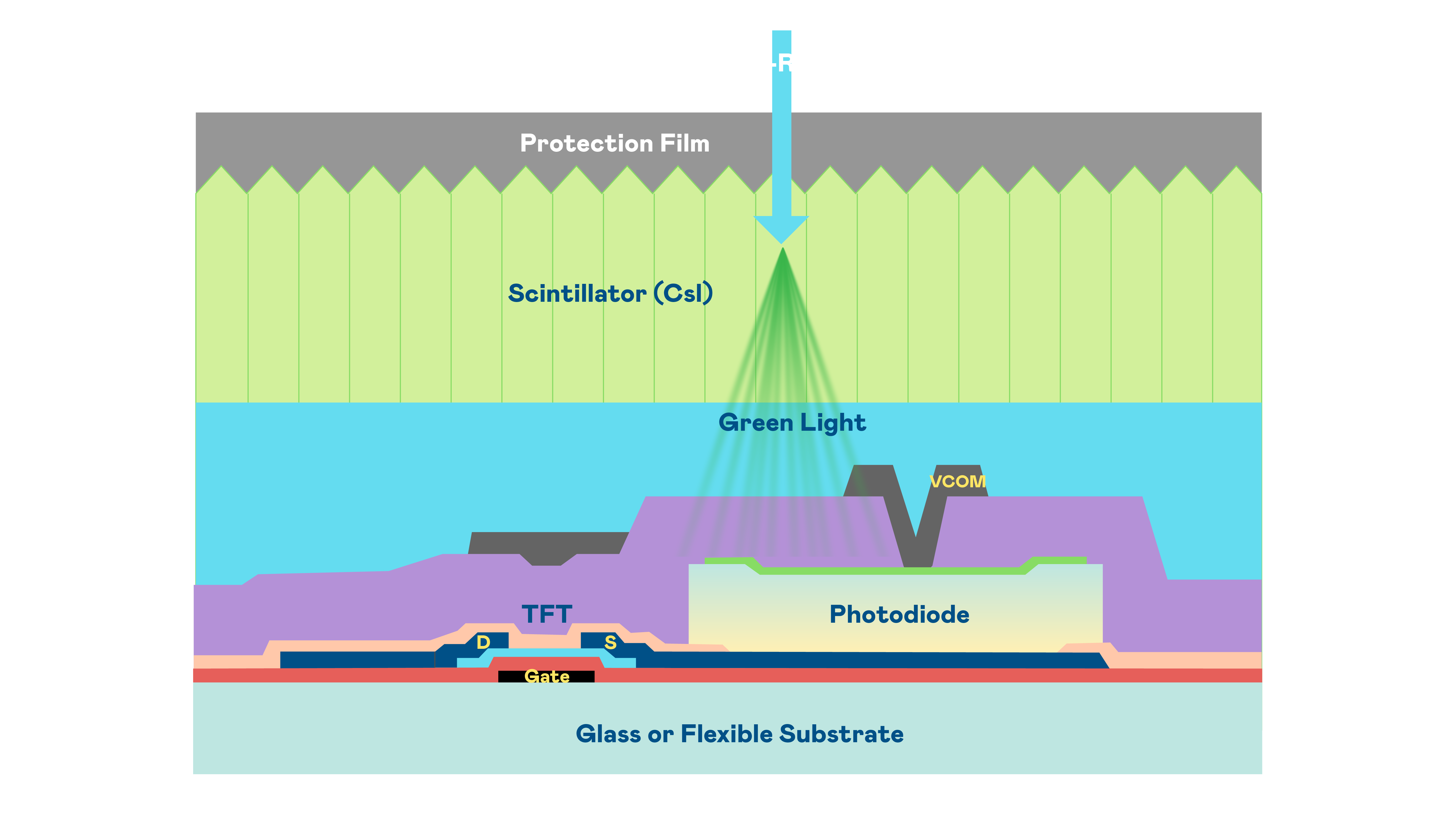 3499拉斯维加斯的X光影像感测阵列使用薄膜电晶体 (TFT) 作为每个像素的读取开关,搭配光电二极体(Photodiode)的光电转换元件,用以感测X光影像讯号。