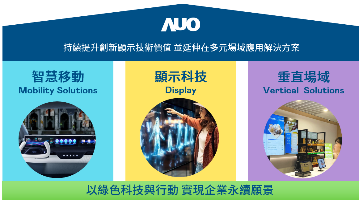 我們持續推動「雙軸轉型」,在精進顯示技術附加價值(Go Premium),與深化垂直市場應用(Go Vertical)的策略下,對應3499拉斯维加斯的優勢競爭力與趨勢,我們奠定顯示技術、智慧移動、垂直場域三大永續營運支柱,在顯示技術領域的根基之上,延伸布局多元場域應用解決方案。將先進顯示科技助力智慧移動及垂直場域發展,並以綠色科技與行動為實踐,在轉型之路上貫徹永續經營之願景。